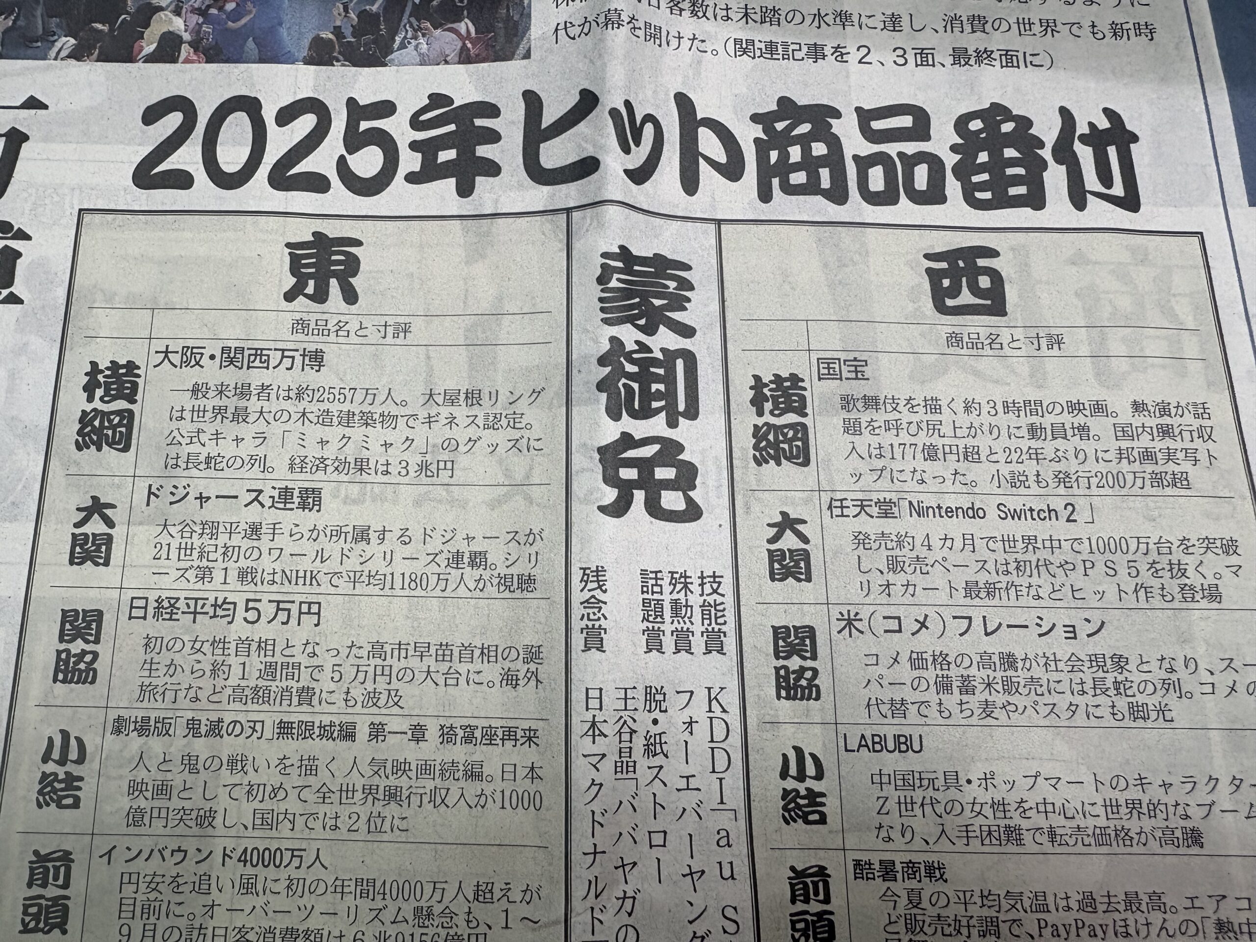 新聞には今年のヒット商品番付が載ってました!